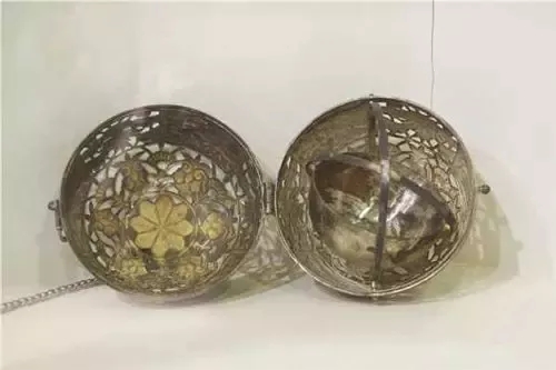 香囊外壁用銀制成,呈圓球形,通體鏤空,